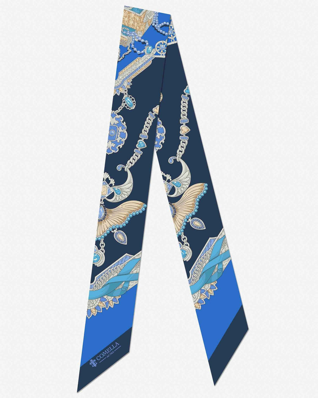Kjo pëlhurë prej mëndafshi të pastër mahnit me dizajnin e saj të detajuar dhe nuancat e nuancuara të ngjyrës blu, ku motivet e xhevahireve dhe frymëzimet baroke ndërthuren në mënyrë elegante. E përkryer për t'u mbajtur rreth qafës, si shirit koke ose e lidhur në një çantë, ajo i shton një prekje të sofistikuar dhe të ndritshme çdo pamjeje.