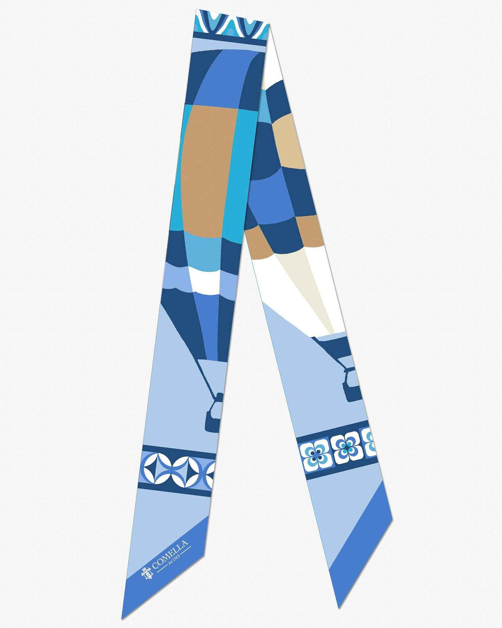 Kjo pëlhurë prej mëndafshi të pastër mahnit me dizajnin e saj të detajuar dhe nuancat e nuancuara të ngjyrës blu, ku motivet e xhevahireve dhe frymëzimet baroke ndërthuren në mënyrë elegante. E përkryer për t'u mbajtur rreth qafës, si shirit koke ose e lidhur në një çantë, ajo i shton një prekje të sofistikuar dhe të ndritshme çdo pamjeje.