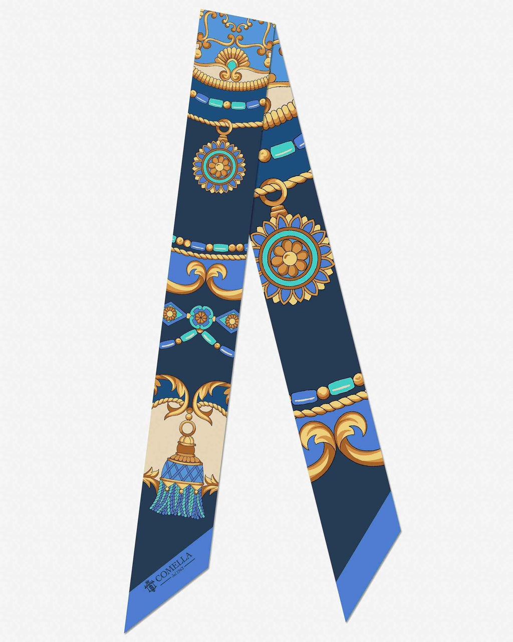 Kjo pëlhurë prej mëndafshi të pastër mahnit me dizajnin e saj të detajuar dhe nuancat e nuancuara të ngjyrës blu, ku motivet e xhevahireve dhe frymëzimet baroke ndërthuren në mënyrë elegante. E përkryer për t'u mbajtur rreth qafës, si shirit koke ose e lidhur në një çantë, ajo i shton një prekje të sofistikuar dhe të ndritshme çdo pamjeje.