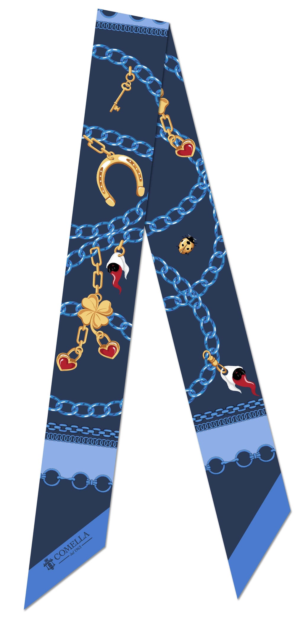 Kjo pëlhurë prej mëndafshi të pastër mahnit me dizajnin e saj të detajuar dhe nuancat e nuancuara të së kuqes, ku motivet e xhevahireve dhe frymëzimet baroke ndërthuren në mënyrë elegante. E përkryer për t'u mbajtur rreth qafës, si shirit koke ose e lidhur në një çantë, ajo i shton një prekje të sofistikuar dhe të ndritshme çdo pamjeje.