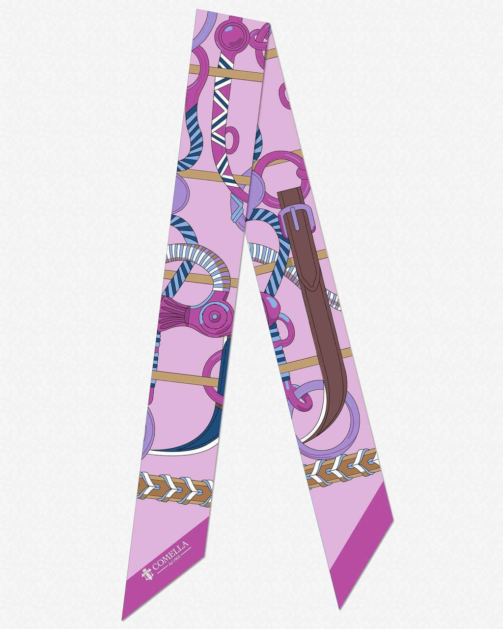 Kjo pëlhurë prej mëndafshi të pastër mahnit me dizajnin e saj të detajuar dhe nuancat e nuancuara të ngjyrës blu, ku motivet e xhevahireve dhe frymëzimet baroke ndërthuren në mënyrë elegante. E përkryer për t'u mbajtur rreth qafës, si shirit koke ose e lidhur në një çantë, ajo i shton një prekje të sofistikuar dhe të ndritshme çdo pamjeje.